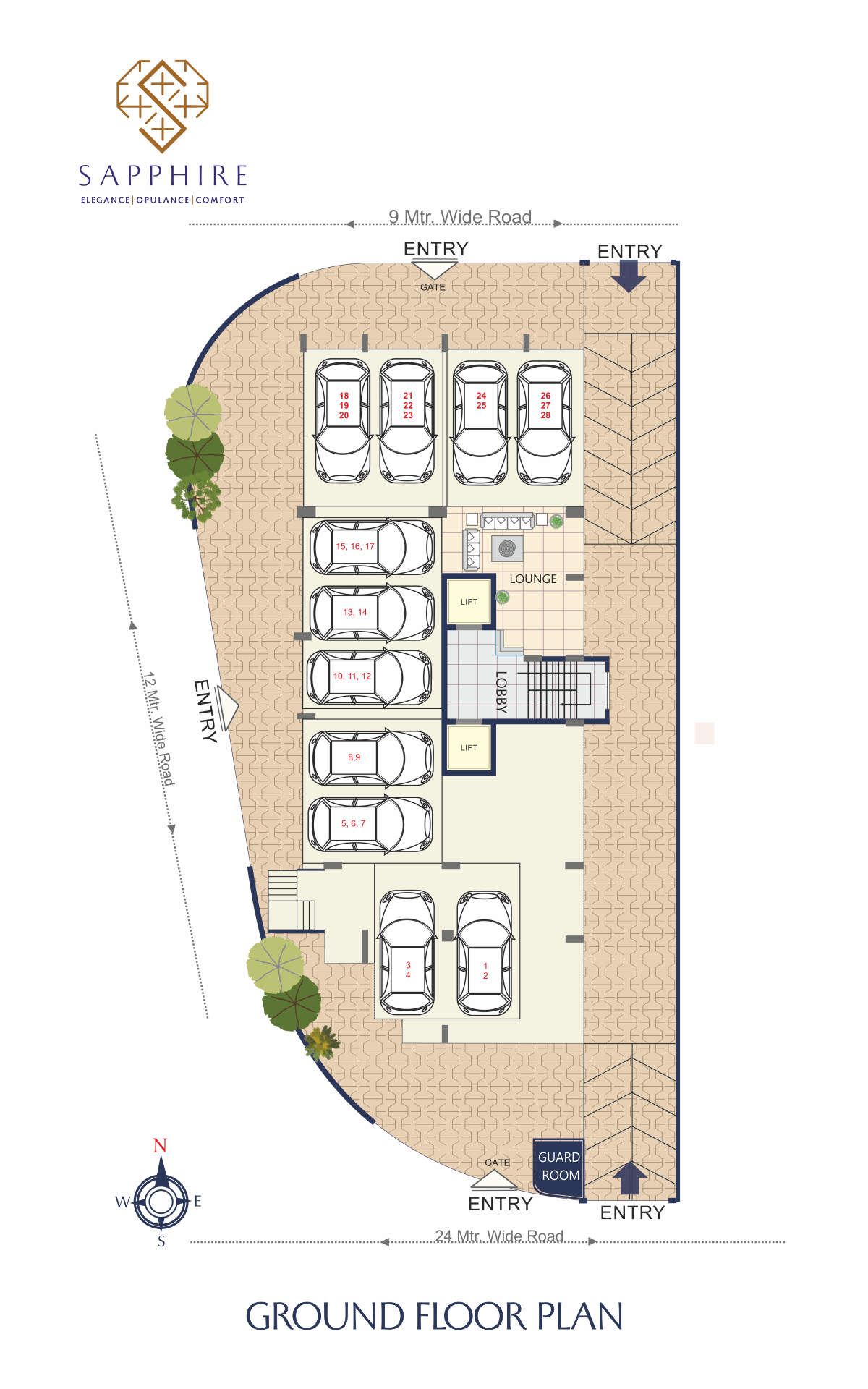The Ground Floor at Sapphire has been thoughtfully planned to ensure secure access, smooth vehicle movement, and a welcoming entry experience. It offers ample covered parking, a stylish entrance lobby, a waiting lounge, and dedicated security for resident safety.